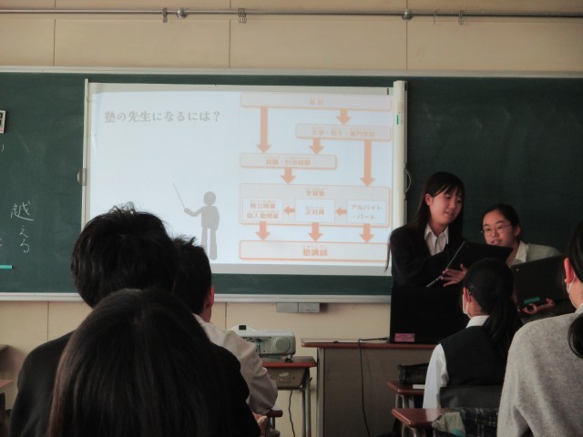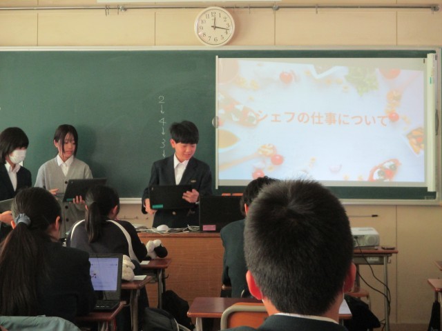 今日の発表では、スライドを使いながら堂々と発表していました。各クラスから推薦された2グループが来週学年発表する予定です。