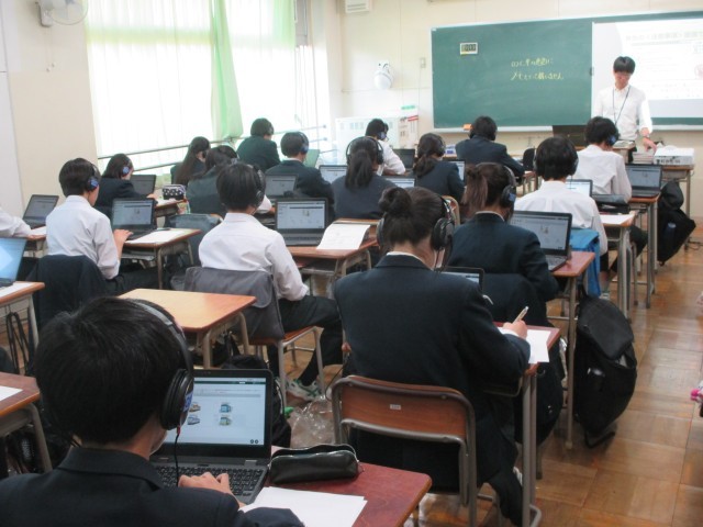 各自のタブレットを使って説明や出題が行われ、「聞くこと」に関してはヘッドセットをつけての取組。みんな真剣に取り組んでいました。