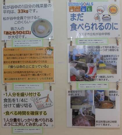 今週は「もったいない大作戦WEEK」ということで、食べ残しを減らす声掛けをしています。昨年度松が谷中から出た食品ロスが6.81tということにとても驚きました。あと一口でロスをかなり減らすことができるそうです。これを機に世界の食糧問題にも目を向けてみてください。