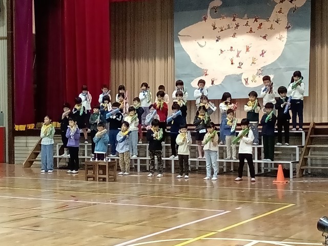 ※写真は、校長先生の話、1年生・3年生・5年生の発表の様子です。