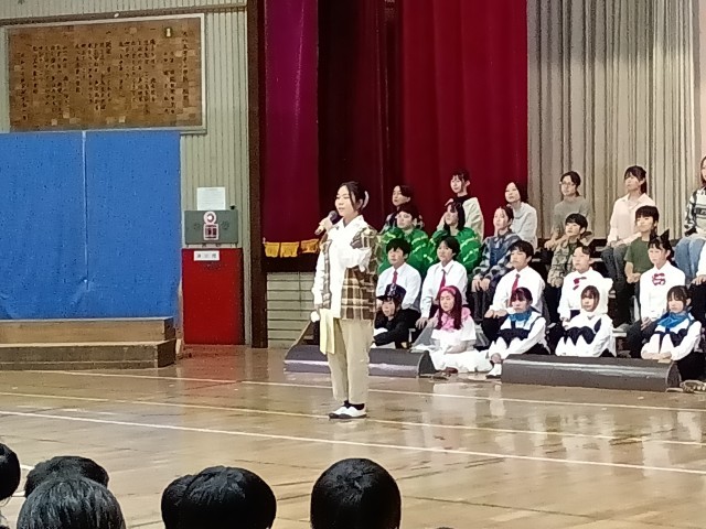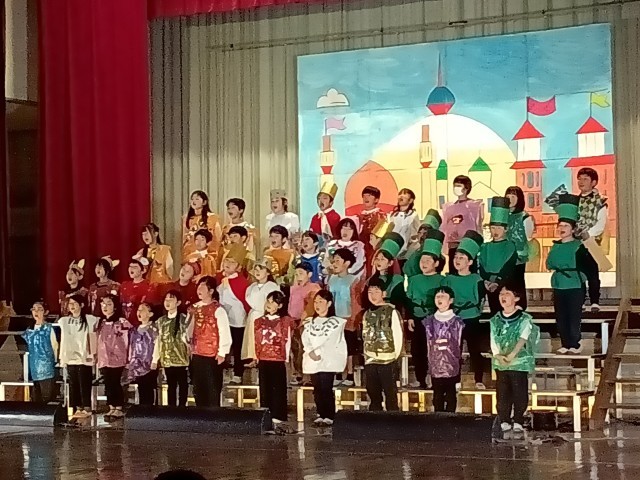 ※写真は、2年生・4年生・6年生の発表の様子と、6年生の終わりの言葉、鑑賞している子供たちの様子です。