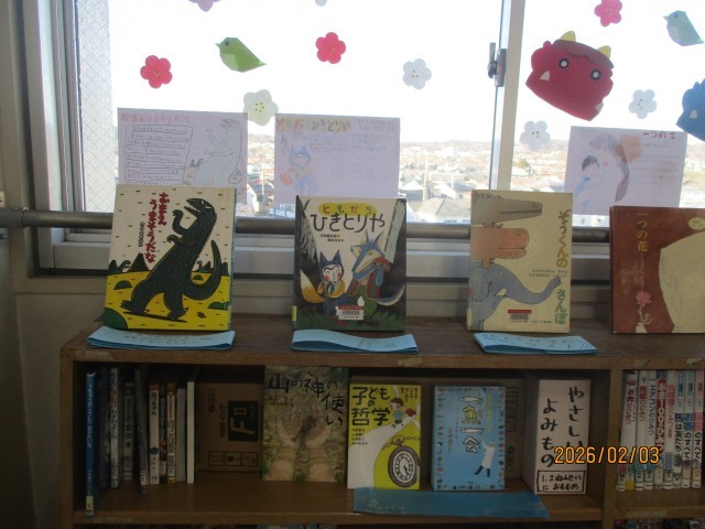 今月は、本カバーのふき取りと5年生の有志が作成してくれた本の帯とポップを飾りました。