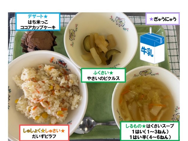 今日の給食では、八王子産の米粉を使った「はち米っこココアカップケーキ」を提供しました。