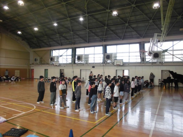 1年生と手をつないで6年生が入場し、1年生から5年生が6年生に向けての出し物を披露しました。