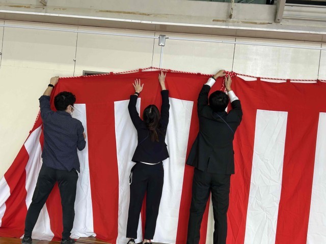 昨日(3月11日)、卒業式に向けて教職員で体育館の式場準備を行いました。