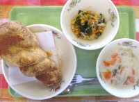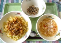 カツカレーライススタミナきゅうりレタスとたまごのスープオレンジジュース 6年生から一番リクエストの多かったカツとカレーライスを合わせて、カツカレーをつくりました。 運動会前日に給食でつくったことを覚...