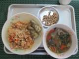 にんじんごはん・ちくわのマヨネーズ焼き・根菜汁・黒糖大豆・牛乳です。