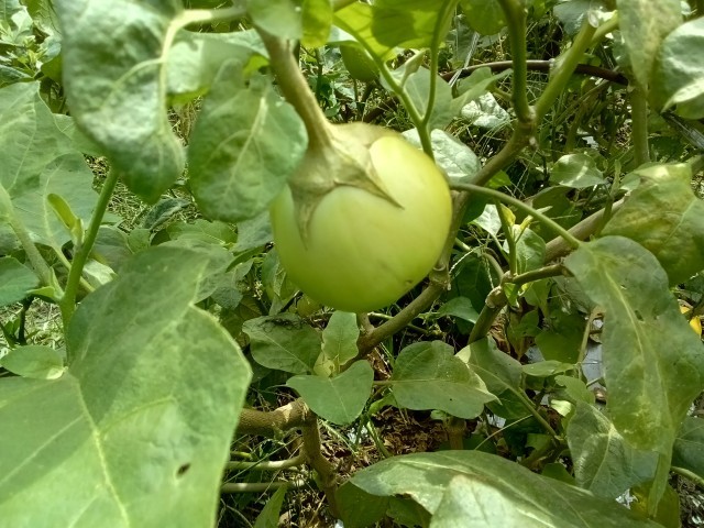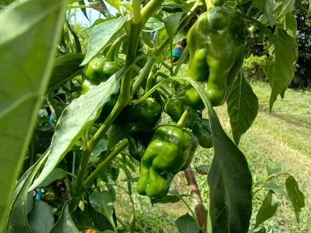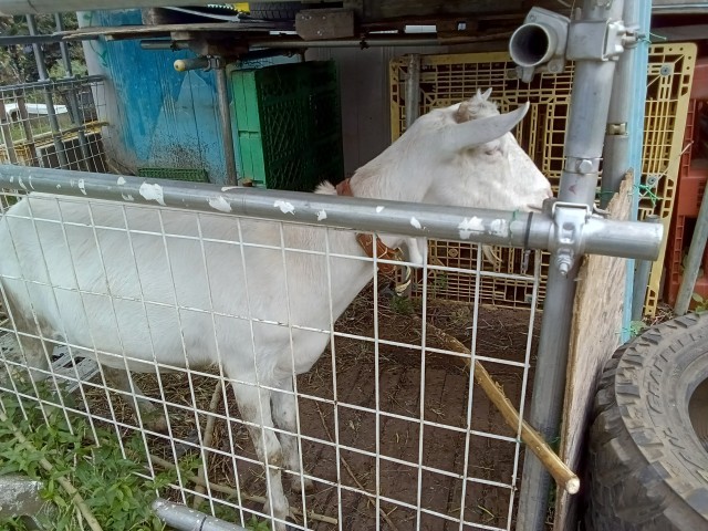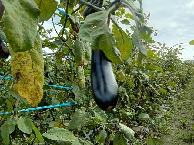 中西さんから畑のお話を聞いています。普通のナス、青ナス、ピーマン、ニンジン、ダイコンなどを作っているそうです。ヤギもいます。