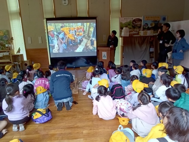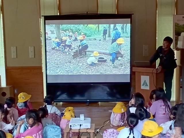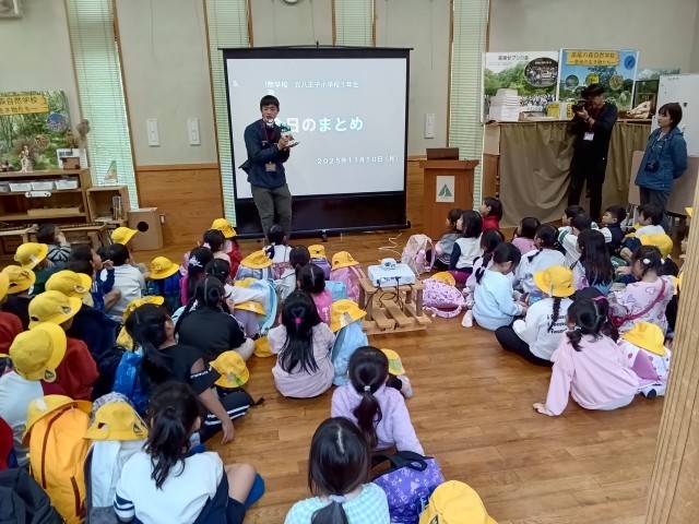 高尾の森自然学校を出発前にホールで今日のまとめのスライドを見て、スタッフの皆さんにお礼を言って学校に向かいます。
