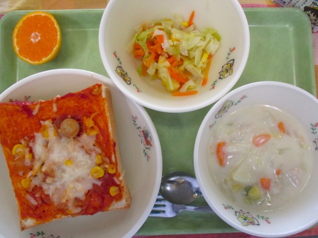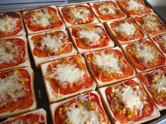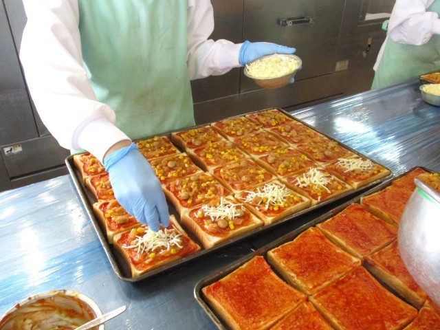 写真1:ピザトーストに手づくりソースをぬって、具とチーズをのせている様子(ソース、具はすべて手づくりです)