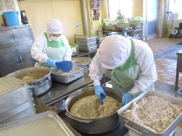 写真1:天狗ごはんをクラス分に配缶している様子(奥の人が大まかな量を容器に入れて、手前の人が秤を使って適量に調整しています)