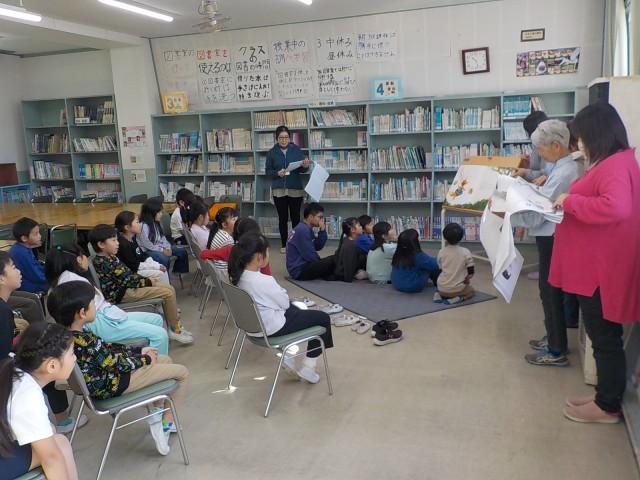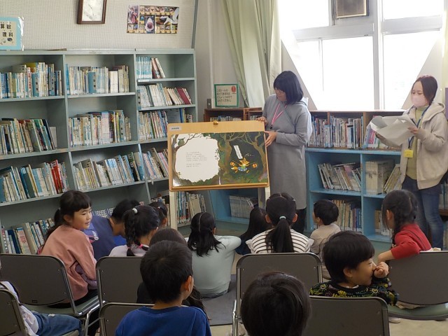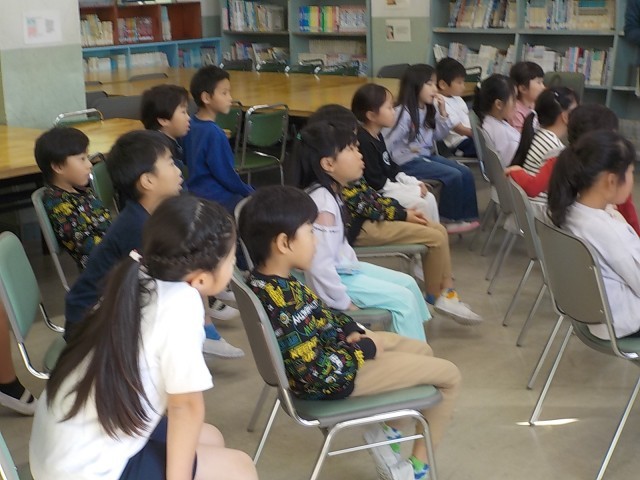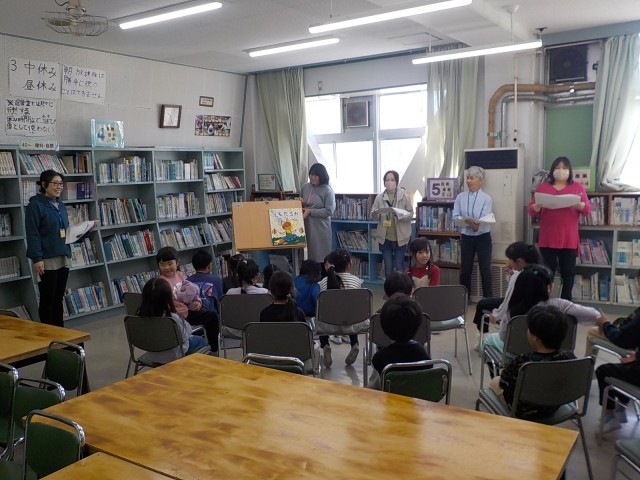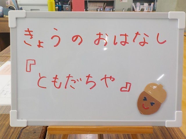 今日の中休みに図書室でブッキーさんによる読み聞かせがありました。読んでくださった本は「ともだちや」です。子どもたちは熱心にお話を聞いていました。