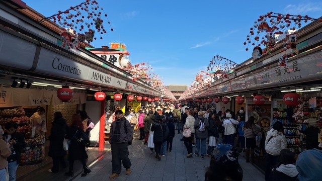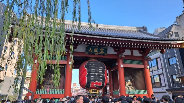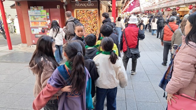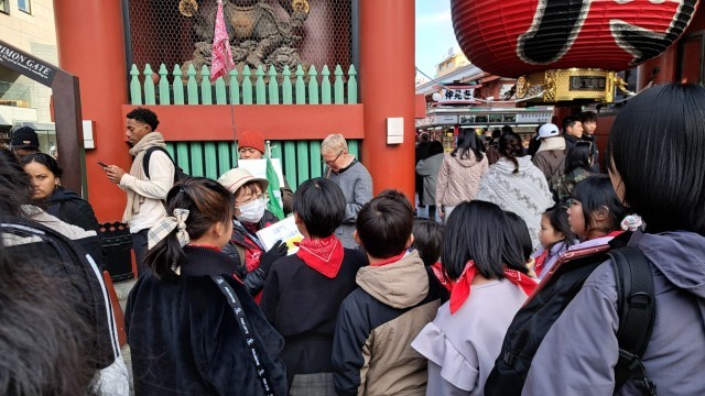 雷門、仲見世は混んでいます。子どもたちはガイドさんのお話をしっかり聞いています。