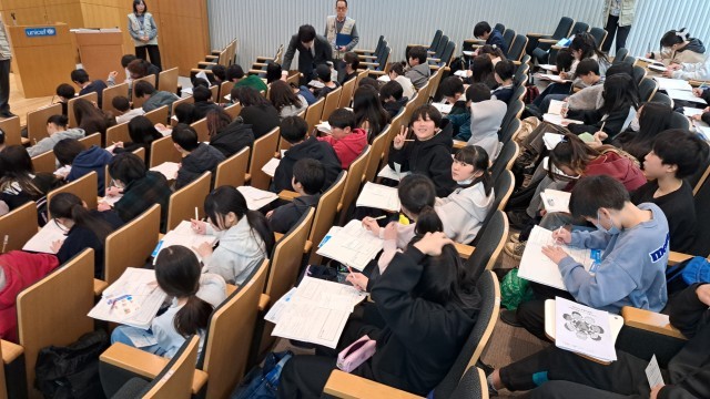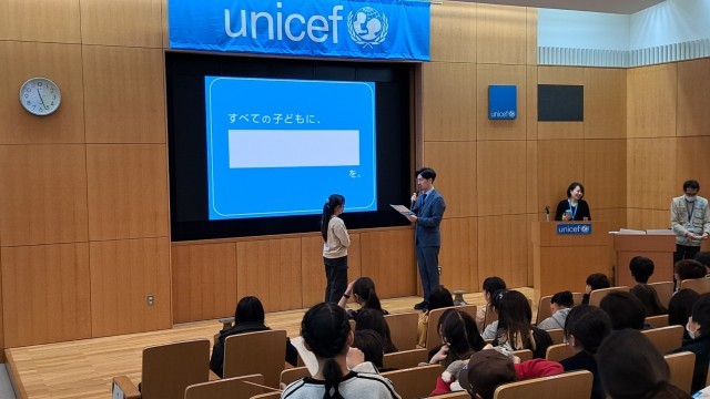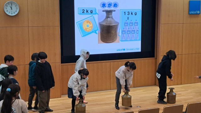 ガイドさんからお話を聞いた後、ホールで映像を見ながら世界の子どもたちについて考えました。最後に元八王子小学校のユニセフ募金を担当の方にお渡ししました。