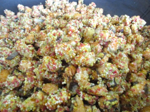 角切りのますに、五色のぶぶあられをまぶしたからあげです。ますの桜色と、カラフルなあられが相まって、かわいらしく仕上がりました。