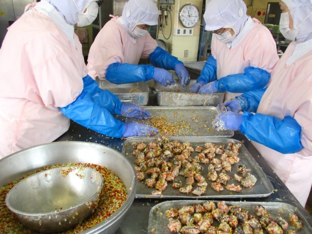 写真1:ますにあられをまぶしている様子