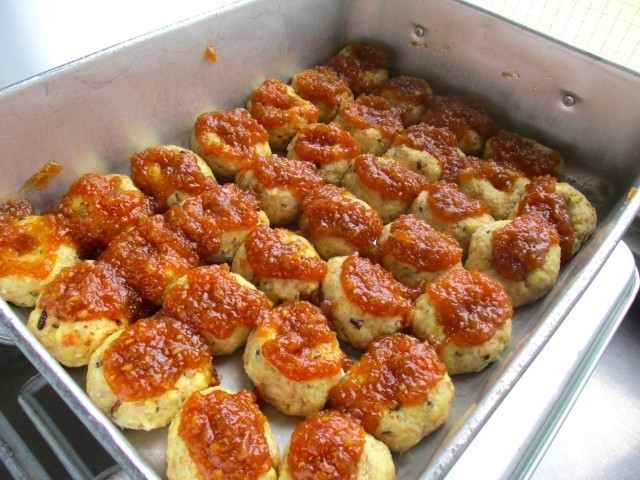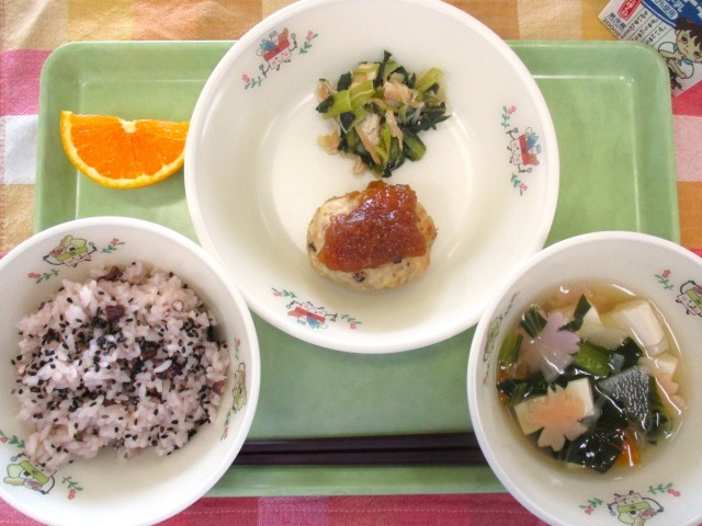 写真1:給食室で手作りした豆腐ハンバーグにたまねぎソースをかけました