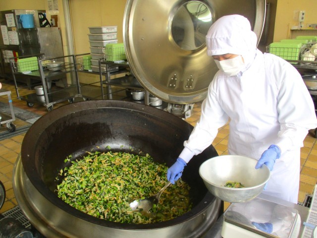 写真2:小松菜と油あげの煮びたしを配缶している様子