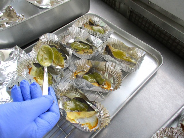写真1:焼いた白身魚に桑の葉粉が入ったみそマヨネーズソースをかけている様子