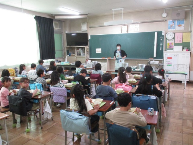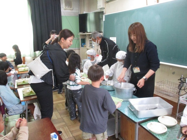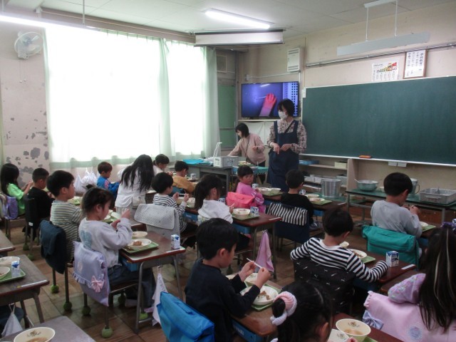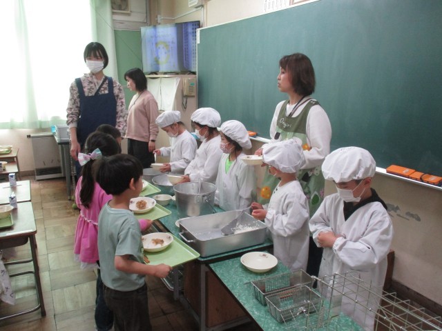 1年生は今日から給食が始まりました。上手に配膳して、おいしくいただきました。