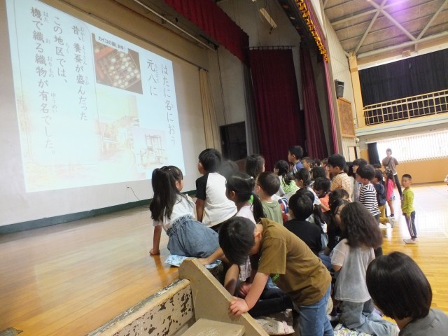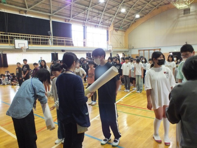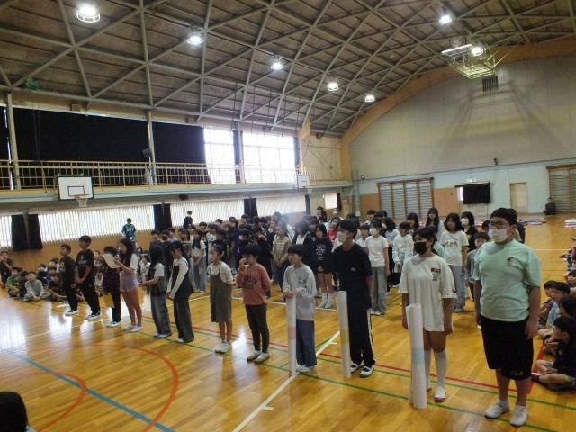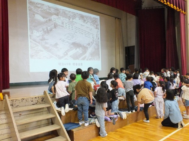 6年生は校歌の歌詞をスライドで説明し、教室掲示用の校歌の歌詞をプレゼントしました。