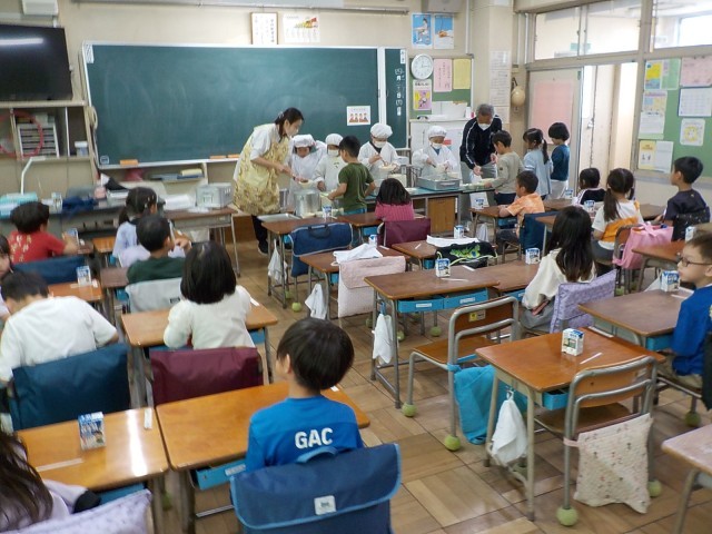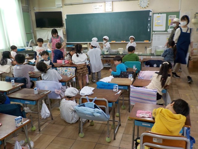 給食6日目の1年生の様子です。どんどん上手に配膳できるようになっています。