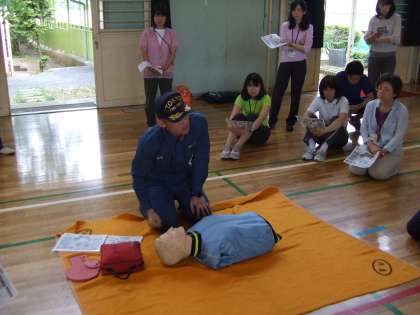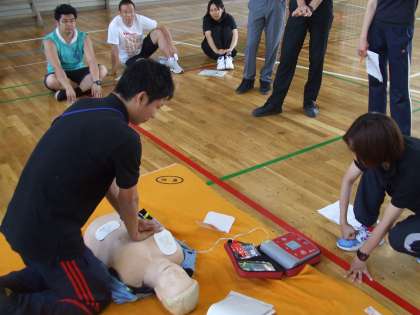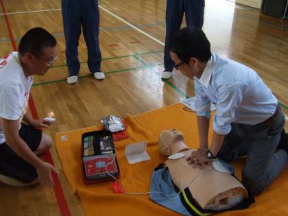 消防署の方を講師にむかえ、心臓マッサージの方法、AEDの使用法などを実地に訓練し、不測の事態に備えます。