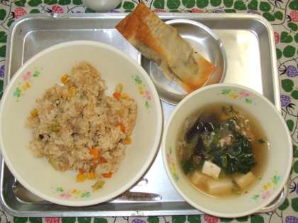 ツナとレタスのチャーハン・棒ぎょうざ・小松菜と春雨のスープ・牛乳です。