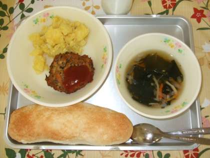 スイートロールパン・豆腐ナゲット・カレーこふきいも・えのきのスープ・牛乳です。