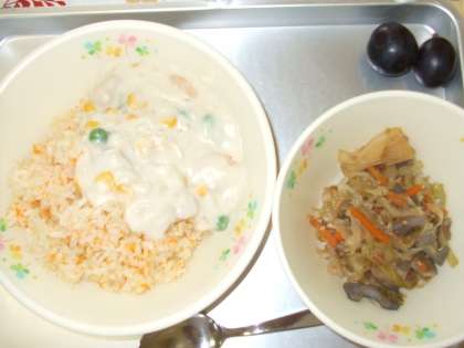 キャロットライス・エビクリームソース・れんこんとキャベツのサラダ・牛乳・ブドウです。