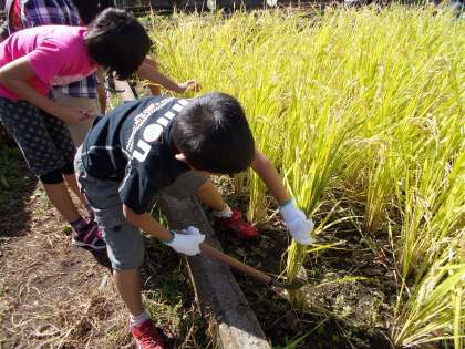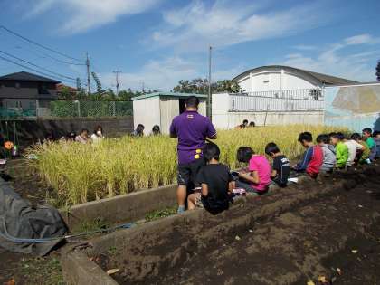 1学期に田植えの場面を紹介しました。5年生は夏休み中、水やり当番も頑張りました。今日は観察した後、稲刈りです。