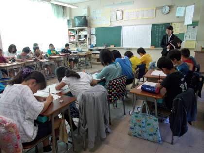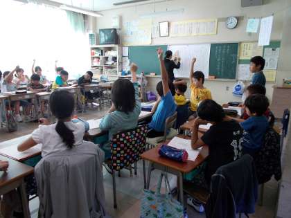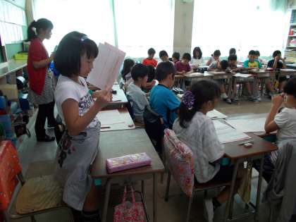 教育実習生の先生と、本文に書き込みをして、自分たちで指名、発表し合いながら、読み取りを進めています。