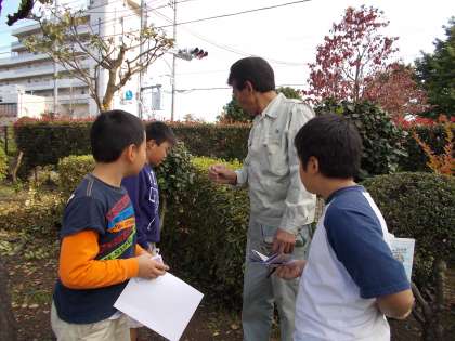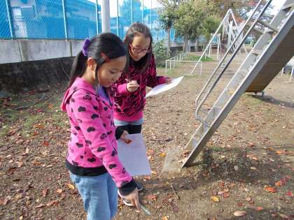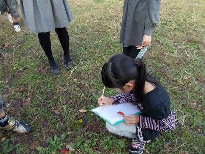 校庭で、秋を探しています。季節はずれのタンポポ?いやいや西洋タンポポは結構年中花をつけています。さて、秋は見つかったでしょうか?