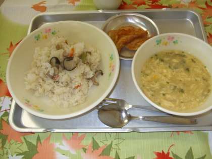 きのこわふうピラフ・タンドリーチキン・コーンとたまごのスープ・牛乳です。
