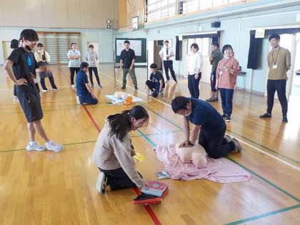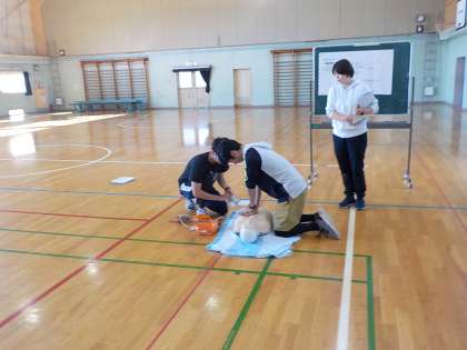 毎年、水泳指導開始前にAEDを用いた応急手当(心肺蘇生法)の教員研修を行っています。