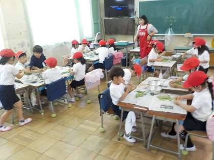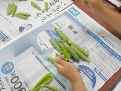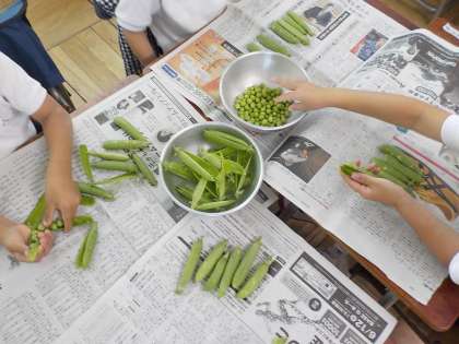 明日の給食に出るグリンピースごはんのために1年生がさやむきをしてくれました。