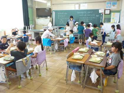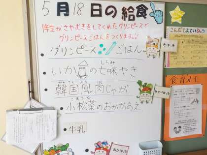 今日の給食は昨日さやむきをした「グリンピースごはん」です。