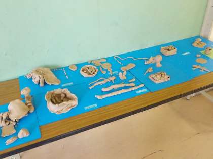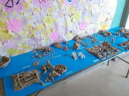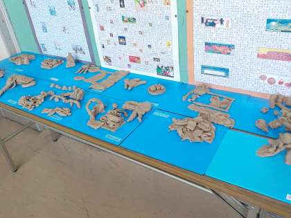 2年生の教室前には、ねんどで作った作品が展示してあります。