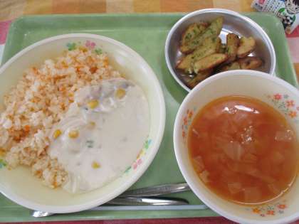 子どもたちが食べやすいように、色紙切りにした野菜とベーコンをじっくり煮てつくりました。野菜のうま味がたっぷりつまっています。
