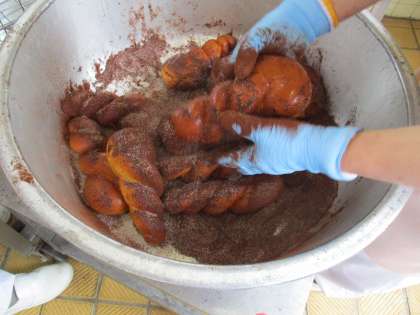 写真2:揚げパンにココアパウダーをまぶしている様子