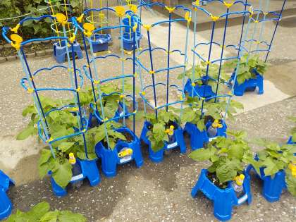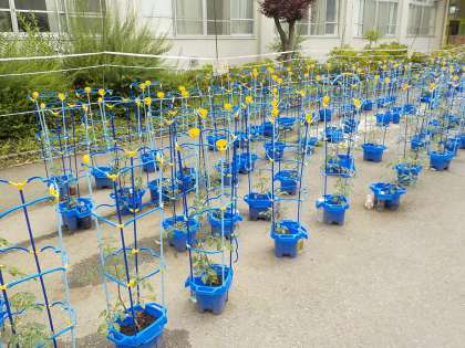 中庭のアサガオ(1年生)とミニトマト(2年生)がぐんぐん育っています!