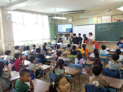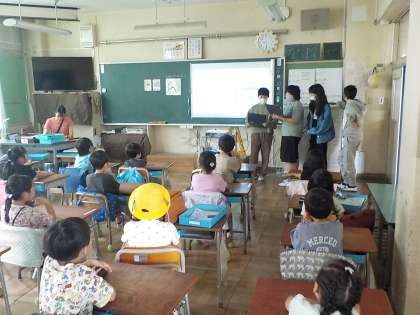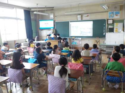 6年生が日光移動教室の学習のまとめとして、1〜5年生とくわのは学級にスライドを使って発表しました。