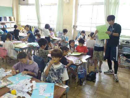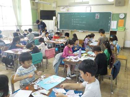 ビー玉を転がしてできた模様の紙をちぎって、台紙に貼っていました。