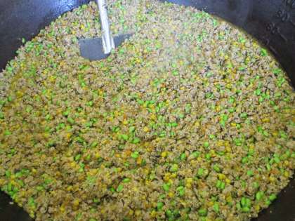 開拓丼は、みその香りと豚肉、大豆を北海道の大地に見立て、とうもろこしをつかい北海道の開拓時代を表現した料理です。みそをベースとした甘じょっぱい味付けが印象的で、子どもたちも美味しそうに食べていました。