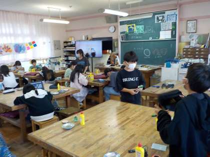 図工室ではものづくりクラブがまつぼっくりの飾りを作っていました。