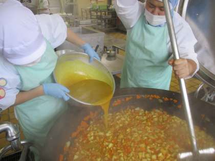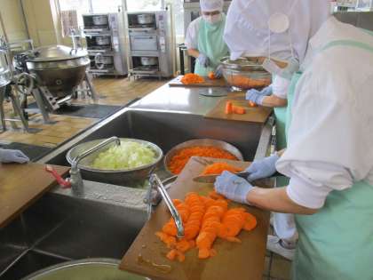 写真1:カレーとスープの野菜につかう野菜を切っている様子