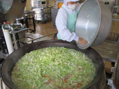写真1:サラダの野菜を釜に入れて茹でる様子
