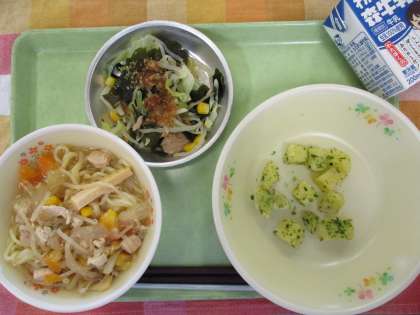 サラダは、野菜の他にツナとわかめが入っています。子どもたちはツナも大好きなのでサラダに入れると苦手な野菜もパクパク食べてくれます。