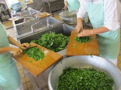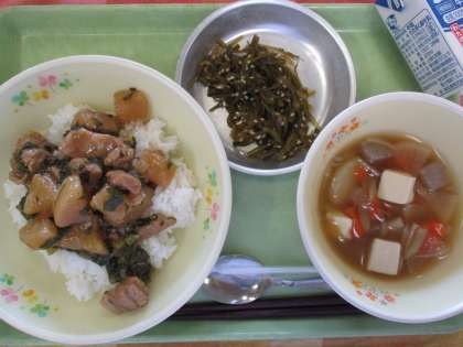 1回目は大根と豚の角煮丼です。味のしみこんだ柔らかい大根にするために、米の研ぎ汁で下ゆでしました。調理員さんが1時間半ほどかけて味をしみこませてくれたので、大根だけで食べても美味しく仕上がりました。