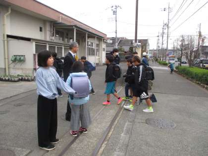 早速、今朝は元八王子中から生徒会役員の生徒と先生が元八小の代表委員と一緒に門のところであいさつをしてくれました。